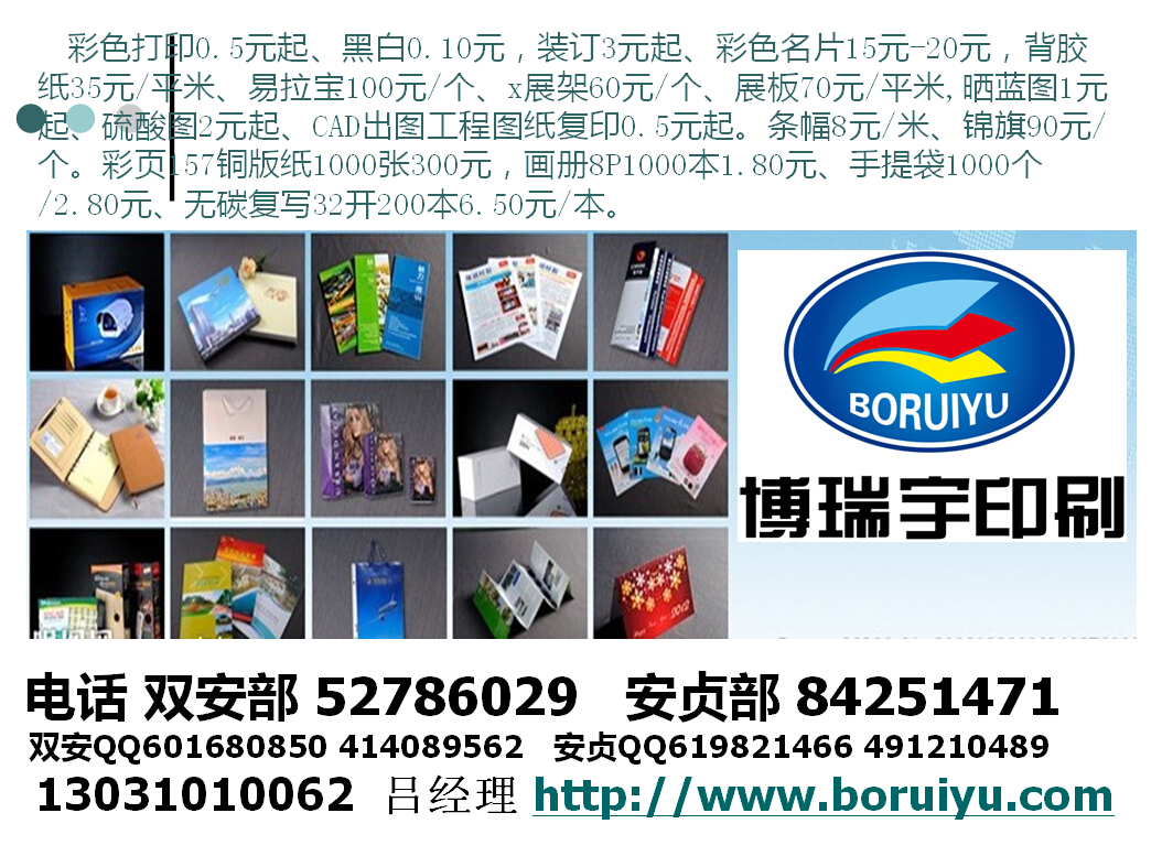 北京圖文快印、數(shù)碼快印、彩色打印、打印復(fù)印,裝訂。瑞思凱數(shù)碼印刷提供的圖文設(shè)計(jì),圖文快印24小時(shí)服務(wù),價(jià)格超優(yōu)惠!的大型數(shù)碼激光彩色印刷機(jī),可以實(shí)現(xiàn)每分鐘近百頁的彩色/黑白輸出速度,可以長時(shí)間滿負(fù)荷運(yùn)轉(zhuǎn),為在短時(shí)間內(nèi)完成客戶交付的大印量活件提供了保證。熟練經(jīng)驗(yàn)豐富的制作人員和品種豐富的精美裝訂和后期加工手段保證了顧客印刷品的質(zhì)量。